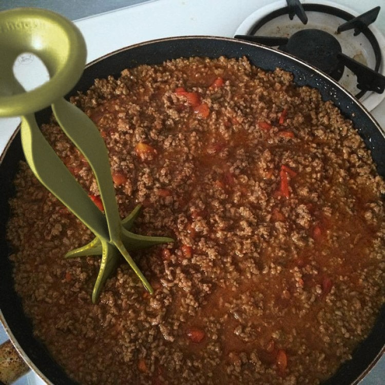 lumps. It will even chop tomatoes and mushrooms as they are added to the pan.